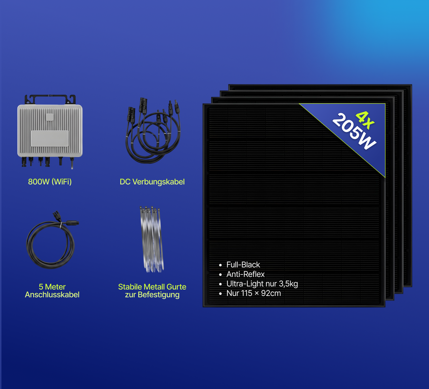 • 820 Wp Gesamtleistung (4x 205 Wp Module)